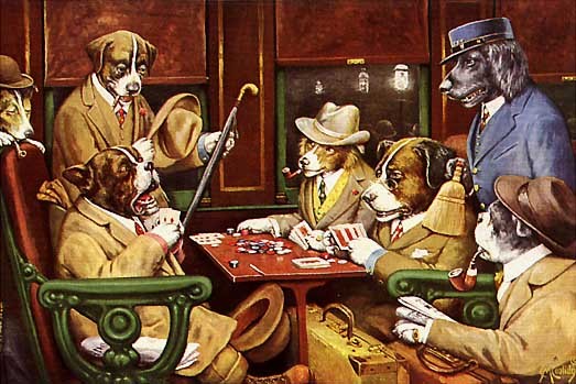 Собаки играют в покер на 9 картинах из 16. Что примечательно, название Dogs Playing Poker чаще всего применяют не ко всей серии, а к самой знаменитой картине — «Друг познается в беде» (A Friend in Need).