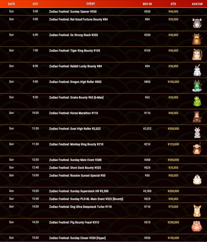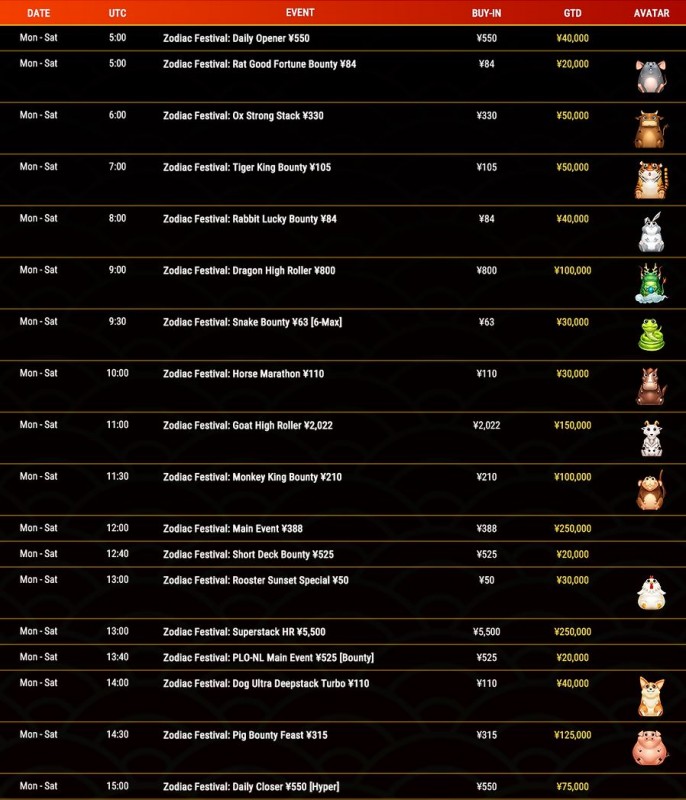 - Испытайте свои навыки на прочность в ежедневном ZODIAC MAIN EVENT. ¥500K гарантия в воскресенье.