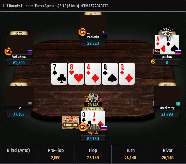 Отличные новости на ПокерОК! Сегодня наш игрок Alphab в турнире Bounty Hunters Turbo Special $2.10 [6-Max] сорвал сногсшибательный Bounty Jackpot в размере $100,000!!!