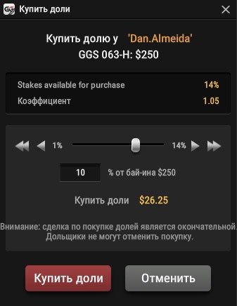 Допустим, игрок предоставляет пакет долей на продажу с некоторым коэффициентом. Мы хотим купить 10% его доли на турнире, так как уверены в его профессионализме. Нажимаем «Купить доли».
