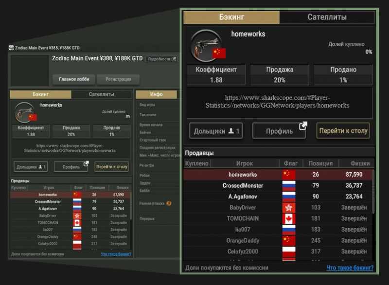 Каждый игрок, выставивший доли на продажу через биржу бэкинга GGPokerok, имеет свою страницу бэкинг-профиля, которая отображает его турнирную историю. Она доступна всем потенциальным покупателям долей, помогает им узнать об успехах игрока и принять окончательное решение при покупке.