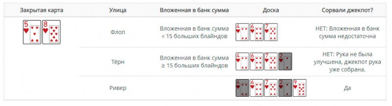 - Если вы внесли в банк меньше 15 больших блайндов на момент, когда собрали джекпот комбинацию, вы не выполните условия получения джекпота.