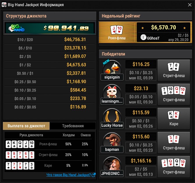 Кэш столы Холдема и Омахи имеют общий джекпот фонд, из которого происходят все выплаты в рамках Big Hand Jackpot.