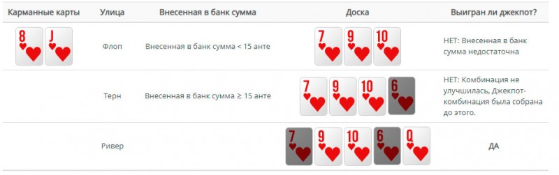 При выполнении всех условий, вы получите джекпот вне зависимости от того, кто выиграл банк, даже если решите сбросить карты.