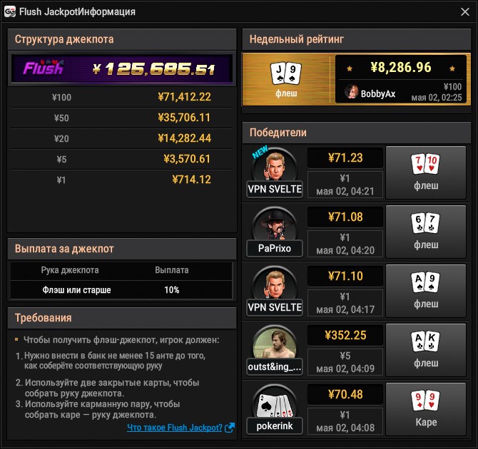 Получите Джекпот, собрав одну из джекпот-комбинаций (флеш, каре, стрит-флеш или роял-флеш) и выполнив все нижеперечисленные условия: