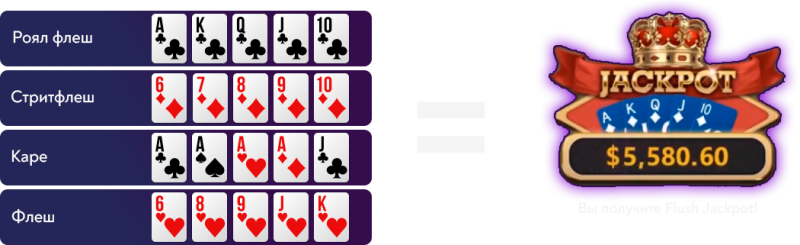 Флеш, каре, стрит-флеш и роял-флеш комбинации дают возможность получить 10% из призового фонда Flush Jackpot.